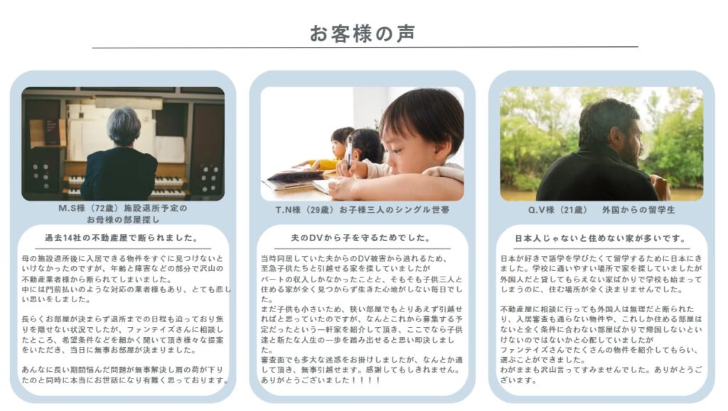 株式会社ファンテイズでは、住宅確保困難者の方々の転居のサポート及び自治体との連携を行い、ご希望の方にはお引っ越し後のお仕事の紹介なども行っております。